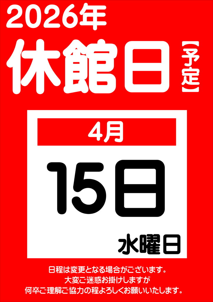 4月15日(水)は館内メンテナンスのため休館を予定しております。