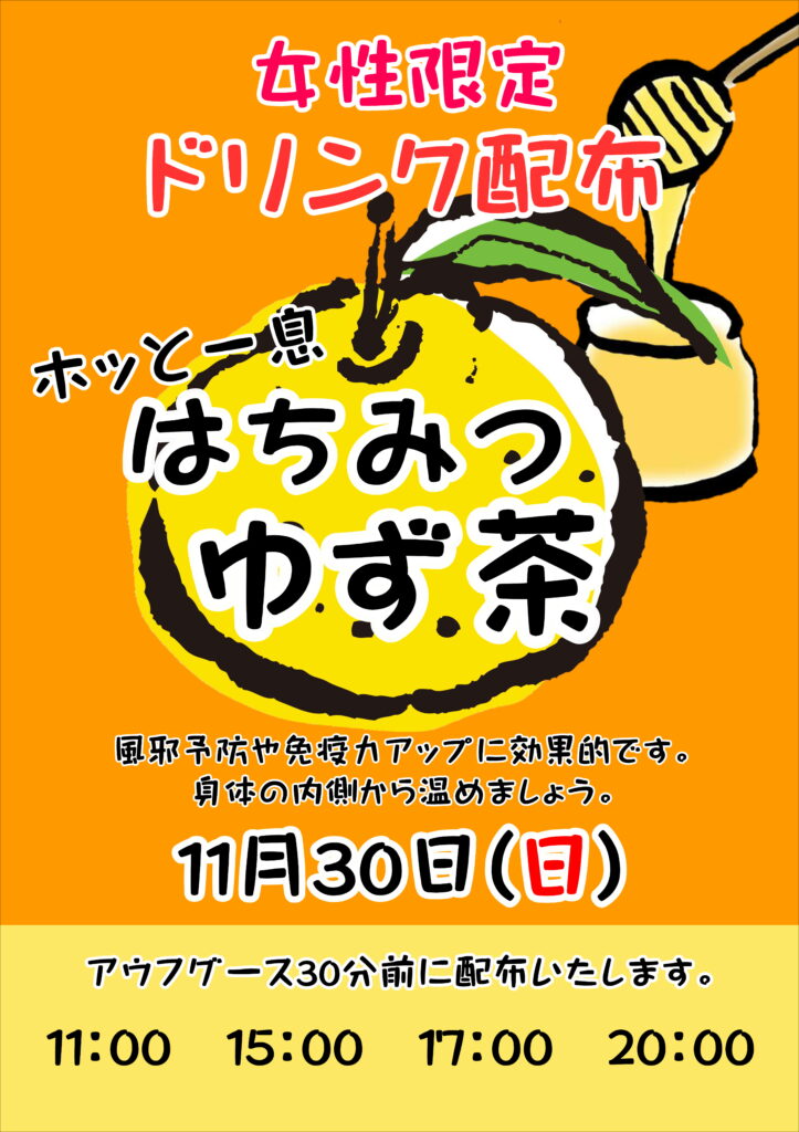30日【はちみつゆず茶配布(女性限定)🍋】